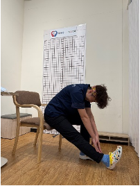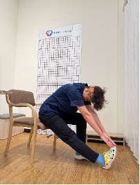 坐骨神經伸展-提升下肢、腰部柔軟度:伸展時將膝蓋頂直下壓,腳被勾起,身體向前彎曲,感受大腿後側的拉伸感。
