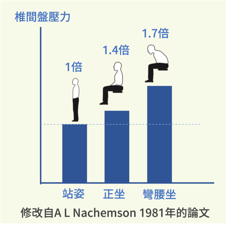坐姿時,腰椎承受的壓力其實比站姿還大(約是站姿的 1.4 倍)。若加上駝背或癱在椅子上,椎間盤承受的壓力更會暴增,容易引發下背痛或椎間盤突出。