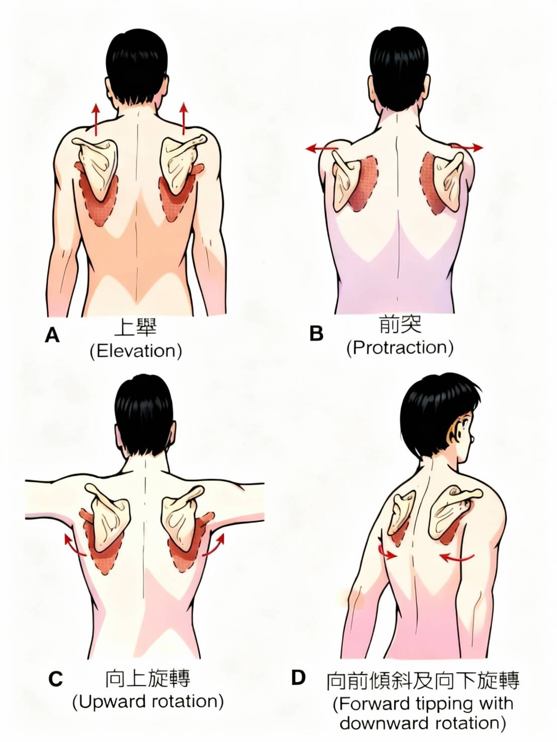 肩胛骨的主要動作方向(圖片來源::運動治療學:基礎理論與實作技巧p.543 17.5)