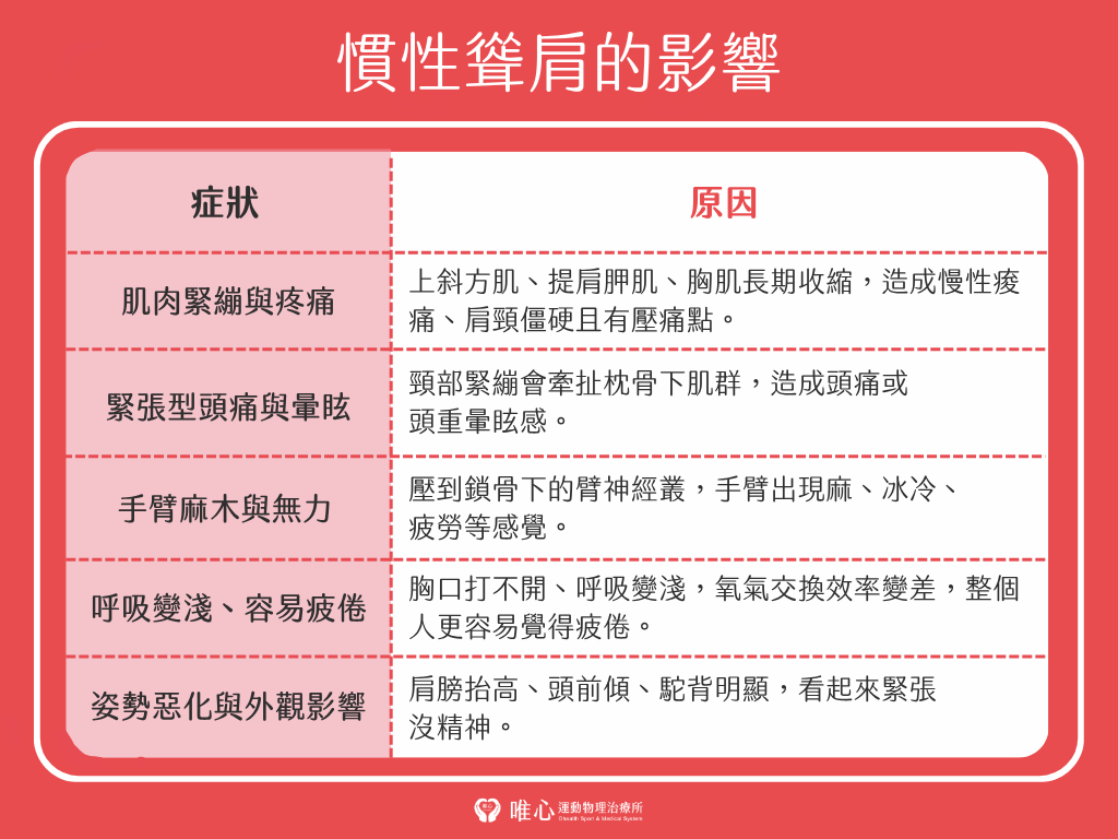 慣性聳肩其實會影響到肌肉、神經、呼吸與整體姿勢系統: