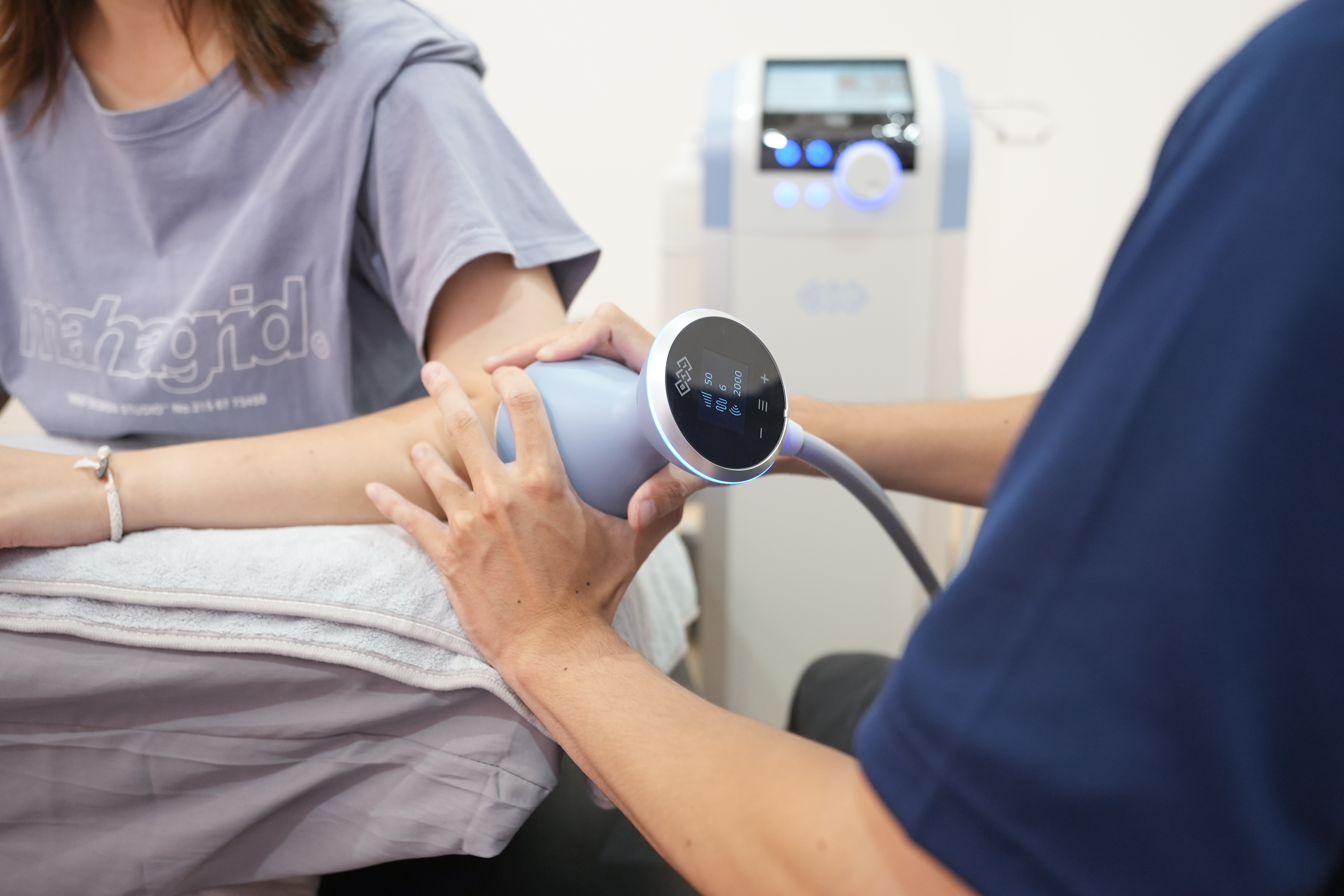 使用震波進行網球肘治療。(圖片來源: 唯心運動物理治療所)