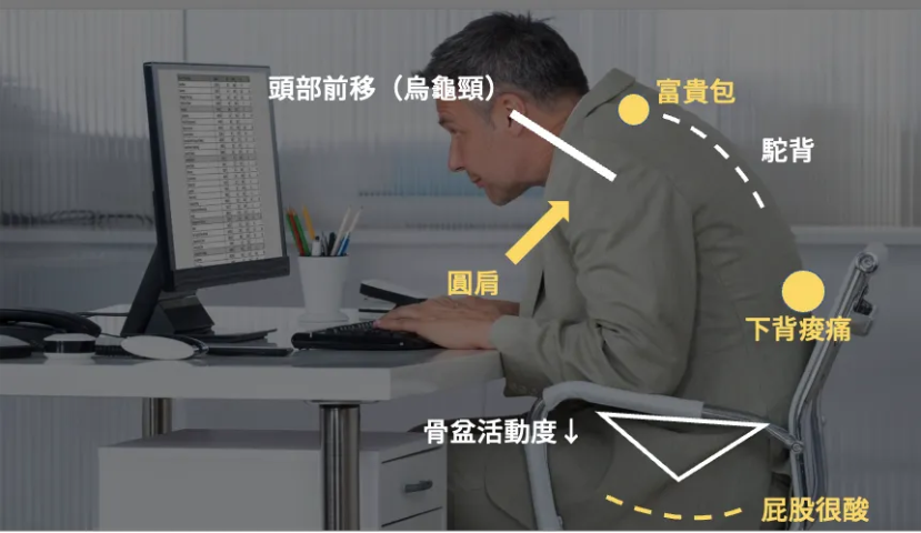 當我們專注看螢幕時,頭部容易不自覺前伸。要知道,我們的頭大約是4公斤,大約跟的保齡球一樣重,頭部每往前伸一點,頸椎受力就會顯著增加!導致肌肉過勞與頸椎退化,並且以下影響我們的體態,形成像是烏龜頸、富貴包等體態變形