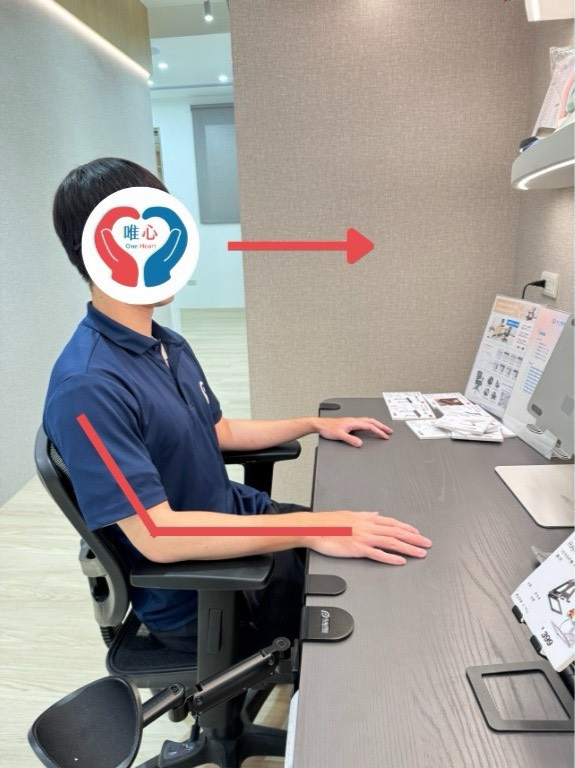 螢幕高度與眼睛平行、鍵盤靠近身體、手肘微彎靠身。使用扶手或桌面支撐前臂,避免手臂懸空。