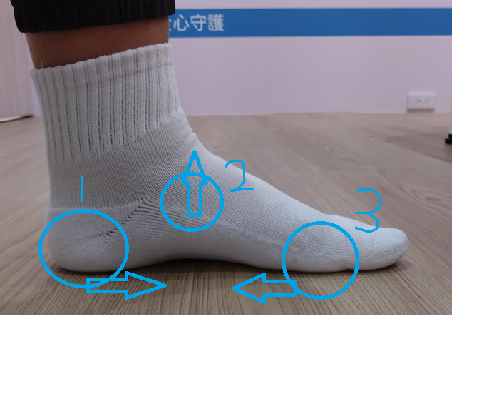 站姿下,1、2、3點分別是腳跟、大拇指球、舟狀骨(可以當作足弓頂端),做1、3靠近、2抬起的發力動作,維持10秒,完成10次。