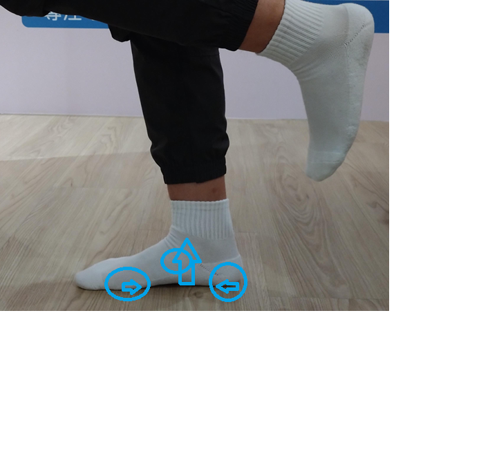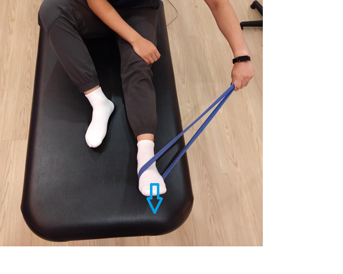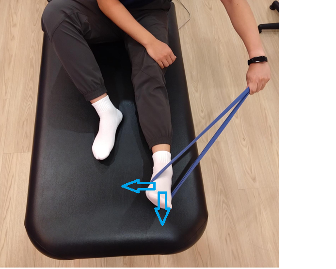 長坐姿,用彈力帶套在足弓上,先做墊腳尖,再做足內翻,對抗彈力繩阻力,動作輕且慢,產生在腳踝,15下,完成3次。