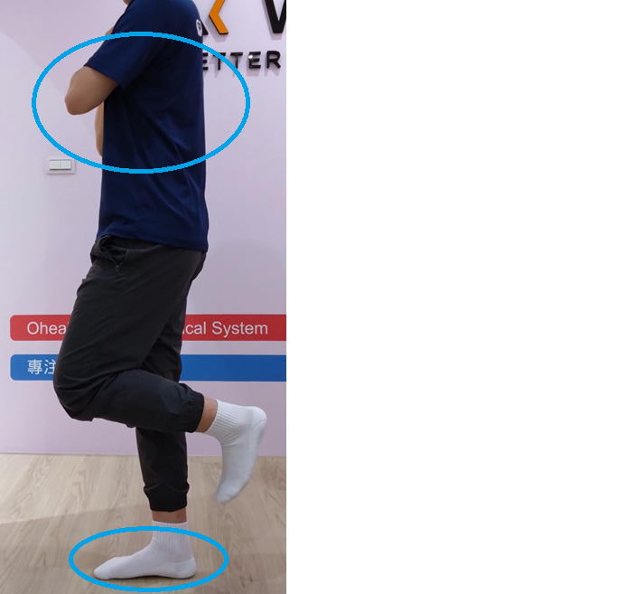 赤腳站在地板上,雙手抱胸,並維持上述提到的縮足動作,單腳站立30秒不搖晃,完成5次。